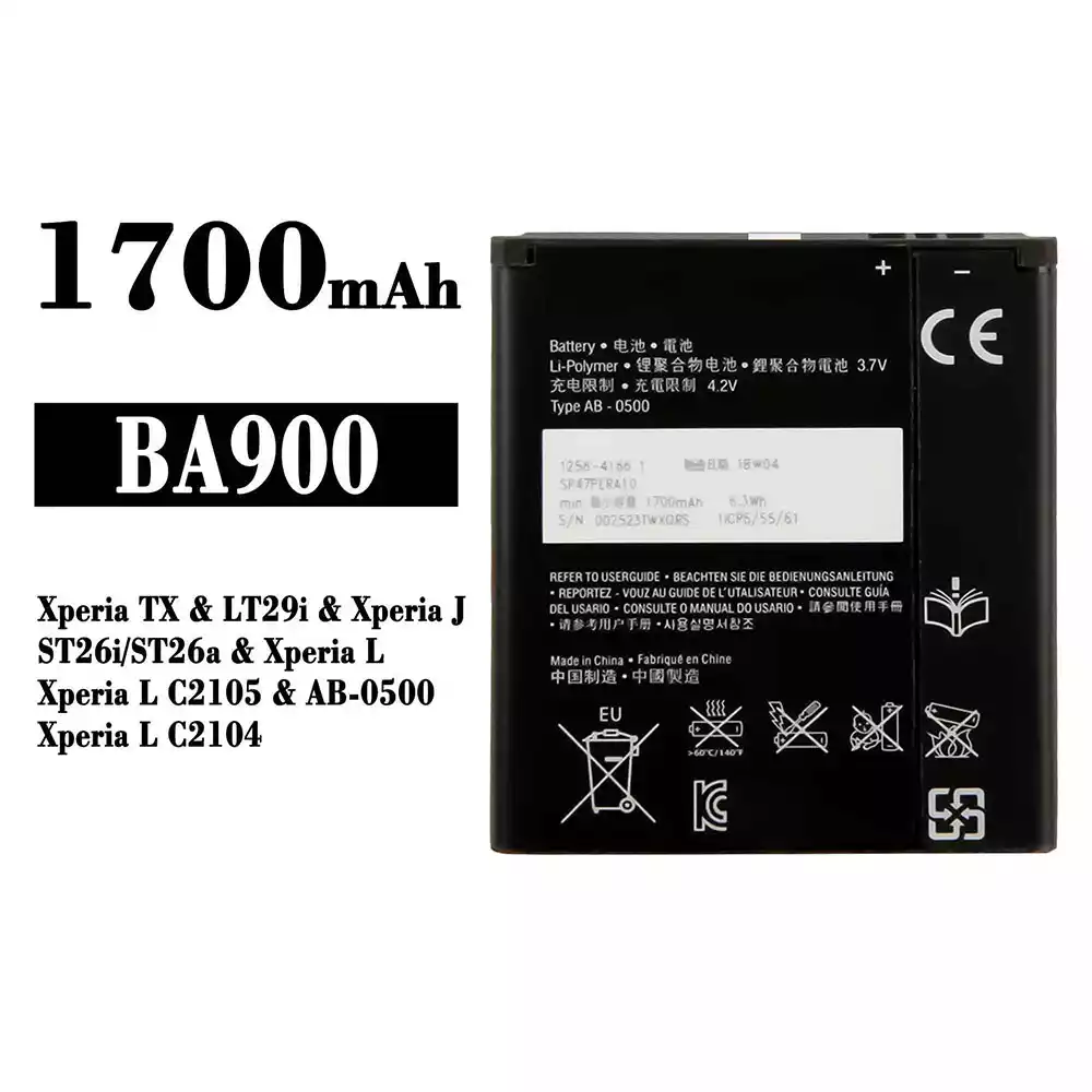 Aku BA900 sobib Sony Xperia TX / LT29i / Xperia J / ST26i / ST26a / Xperia L / Xperia L C2105 / AB-0500 / Xperia L C2104