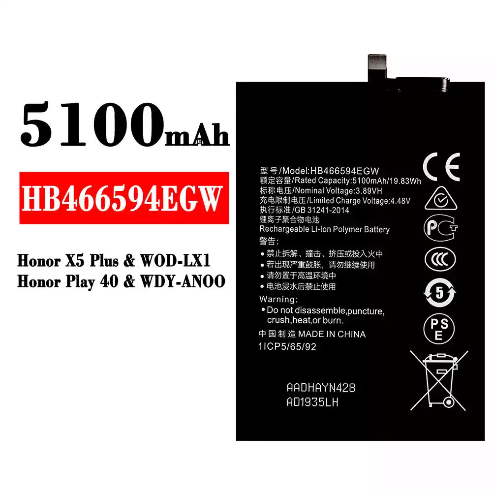 Aku HB466594EGW sobib HUAWEI Honor X5 Plus / WOD-LX1 / Honor Play 40 / WDY-ANOO
